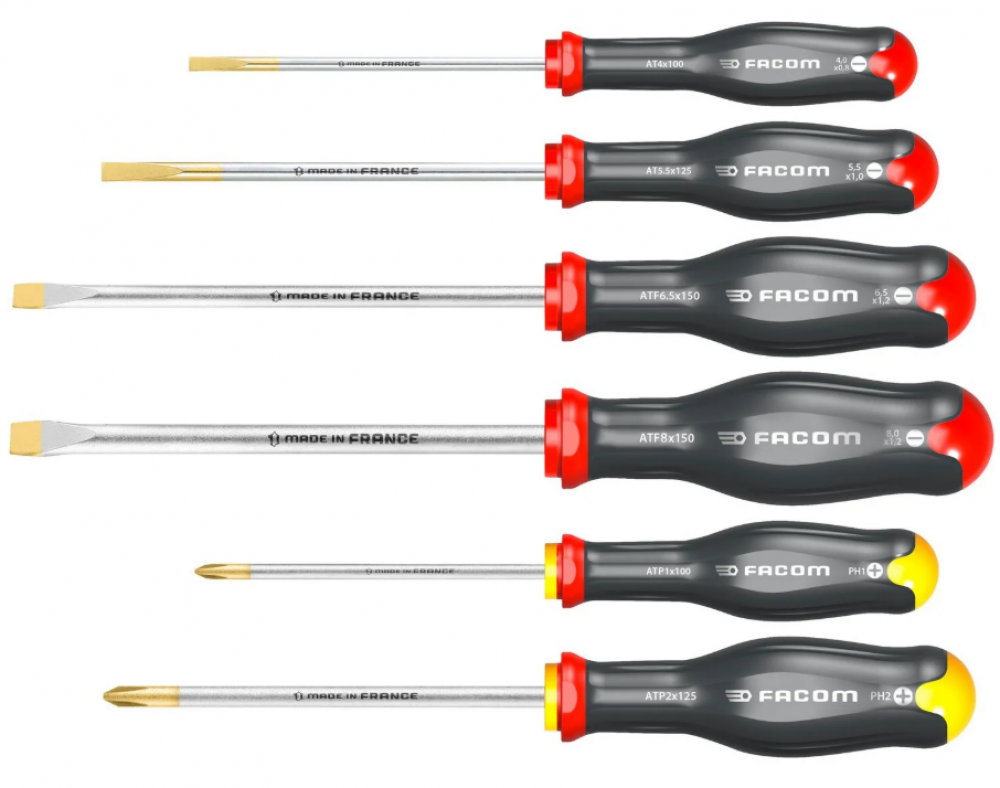 Découvrez le jeu de 8 tournevis Protwist FACOM (réf. AT.J8PB), un incontournable pour les professionnels comme pour les bricoleurs exigeants. Conçus pour offrir une durée de vie supérieure et une résistance exceptionnelle, ces tournevis FACOM bénéficient d’un traitement thermique en ligne, assurant +50% de longévité et +100% de résistance mécanique.