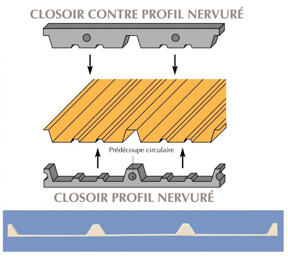 En couverture, les closoirs profils se positionnent sous les bacs aciers, en égout (sablière) par exemple. Les closoirs contre-profils se positionnent sur les bacs aciers (au-dessus), en faitage sous l’accessoire de faitière.
